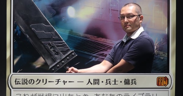 this square Tokyo Game Show 2025 booth has a photo spot Magic: Party Final Fantasy put. Photo point has a copy of the human-sized card “Cloud, Midgar Mercenary” where fans can pose for their card poses like FF14 director Yoshida Niki). Booth provided FF7 Leading Cloud Conflict Nemesis Sword for fans to swing.
